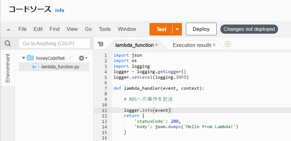 AWSコンソールから Lambdaを選択して、関数を作成します。 Pythonで作成していますが、webhookでhoneycodeから連携した値はeventに入るため、これを使ってRDSを操作します。